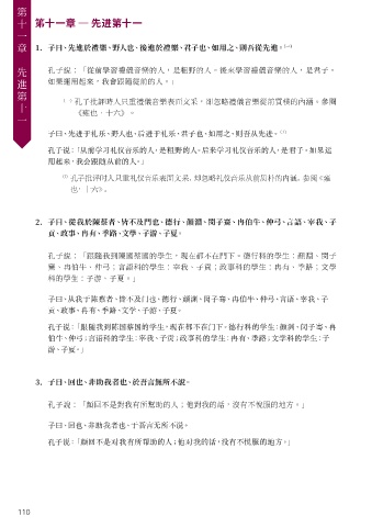 章 1. 子曰、先進於禮樂、野人也、後進於禮樂、君子也、如用之、則吾從先進。 (一)