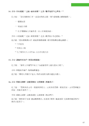 14. 子曰、不有祝鮀 (一) 之佞、而有宋朝 (二) 之美、難乎免於今之世矣。 (三)